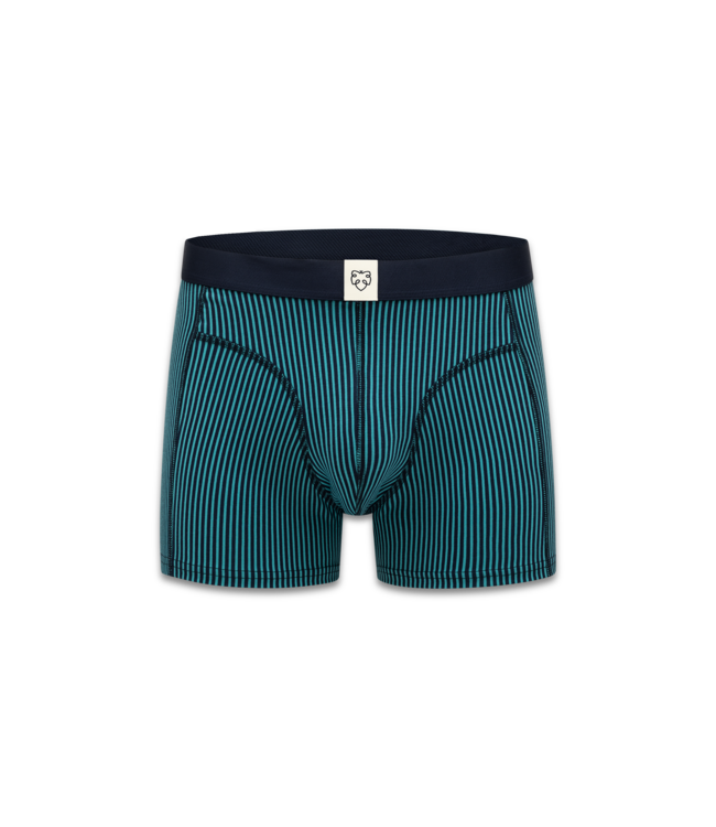De A-dam boxer Navy Twotone Stripe combineert comfort, kwaliteit en een frisse, avontuurlijke uitstraling. De navy basis met turquoise strepen geeft deze boxer een krachtige, zomerse look, geïnspireerd op het ritme van de oceaan.
