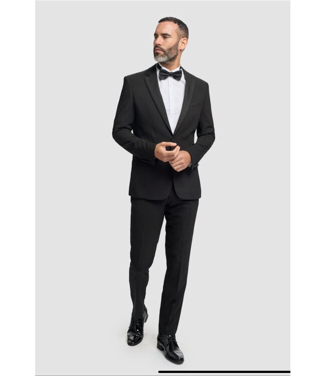 De Cavani smoking in zwart is de perfecte keuze voor heren die tijdloze klasse willen combineren met een modern, verfijnd silhouet. Het colbert is uitgevoerd met een peak lapel waarvan de glanzende satijnen stof prachtig contrasteert met de matte structuur van de rest van het jasje. Deze subtiele maar krachtige combinatie geeft de smoking een luxe uitstraling die moeiteloos opvalt zonder schreeuwerig te zijn.