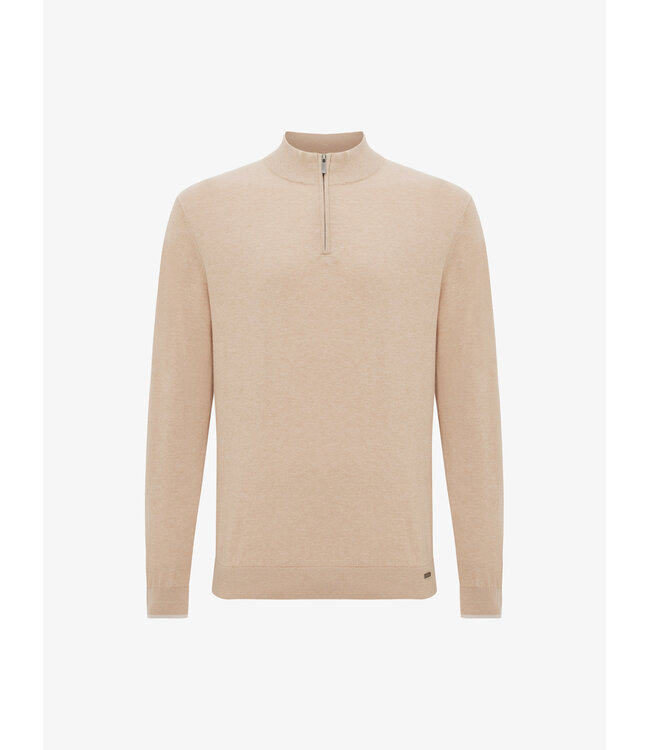 Het ontwerp met halve rits en opstaande kraag geeft de trui een sportief-elegant karakter dat ideaal is voor veelzijdig gebruik, van smart-casual outfits tot verzorgde weekendlooks. De zandkleurige, effen structuur voegt een natuurlijke, rustige tint toe die uitstekend combineert met een chino, jeans of travelpant.